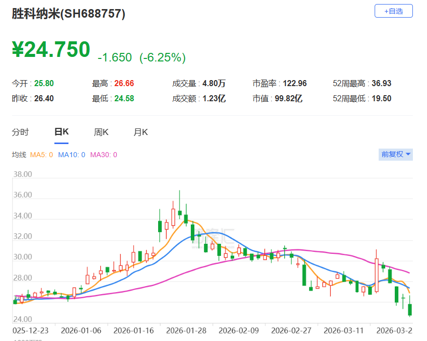 A股异动丨大比例解禁,胜科纳米跌超6%,市值跌破百亿元