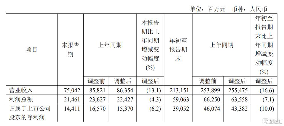 其中,第三季度营收为750.42亿元,同比下降13.1%,环比增加9.5%;归母净利润144.11亿元,同比下降6.24%,环比提升13.5%。