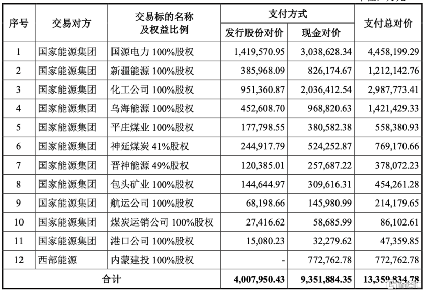 据公告,交易包括购买国家能源集团持有的国源电力100%股权、新疆能源100%股权、化工公司100%股权、乌海能源100%股权、平庄煤业100%股权、神延煤炭41%股权、晋神能源49%股权、包头矿业100%股权、航运公司100%股权、煤炭运销公司100%股权、港口公司100%股权,并以支付现金的方式购买西部能源持有的内蒙建投100%股权。