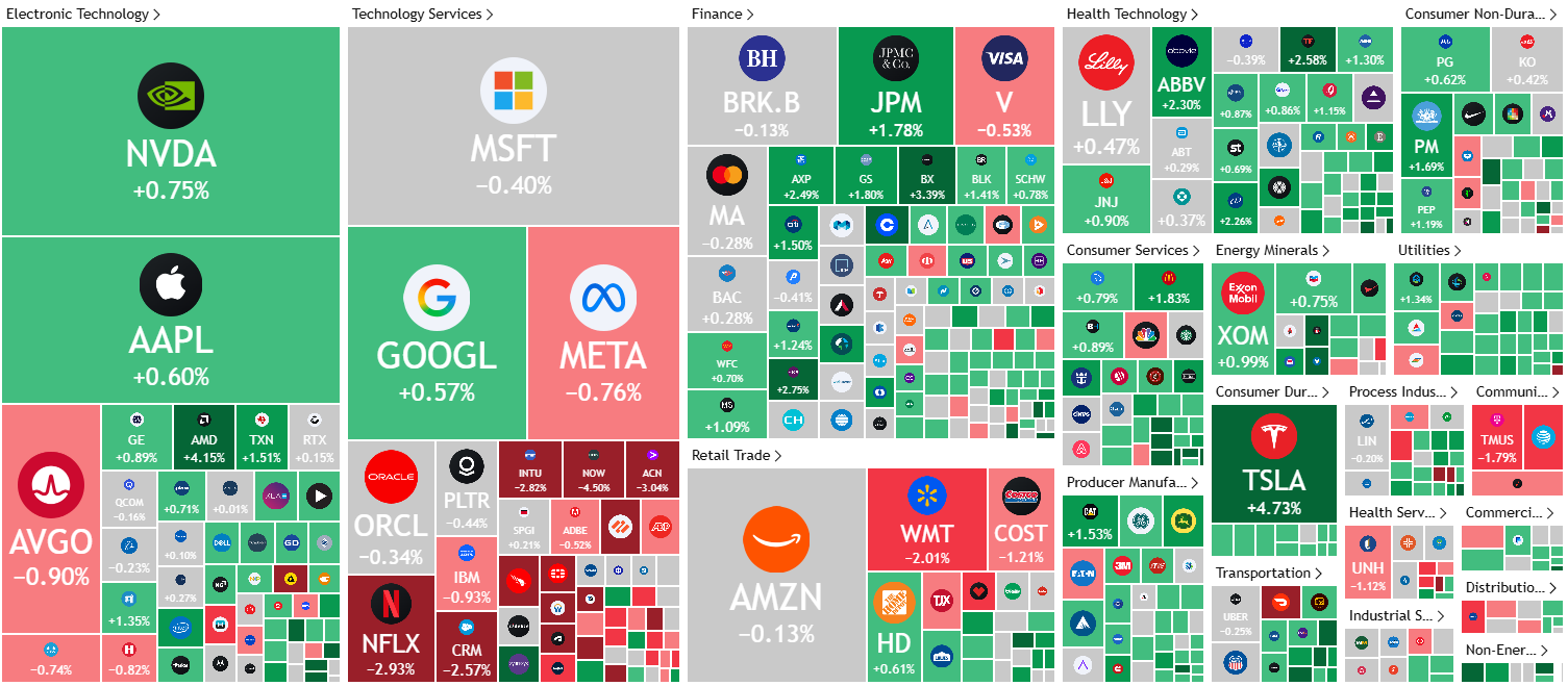 大型科技股涨跌不一,(按市值排列)英伟达涨0.75%,微软跌0.4%,苹果涨0.6%,亚马逊跌0.13%,谷歌C涨0.59%,Meta跌0.76%,博通跌0.9%,特斯拉涨4.73%。