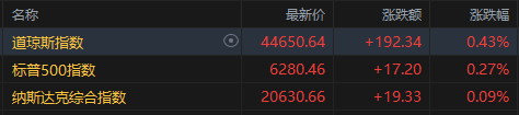 截至收盘,道琼斯指数涨0.43%,报44,650.64点;标普500指数涨0.27%,报6,280.46点,突破了上周四的前高;纳斯达克综合指数涨0.09%,报20,630.66点,连两日刷新纪录。