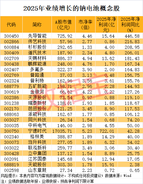 据数据宝统计,业绩数据方面,按照年报、业绩快报、预告净利润下限(无下限则取公告数值)计算,2025年净利润同比增长(含扭亏为盈)的钠电池概念股有25只。其中8股净利润扭亏为盈,包括五矿新能、天原股份、杉杉股份、多氟多、鹏辉能源、传艺科技等。