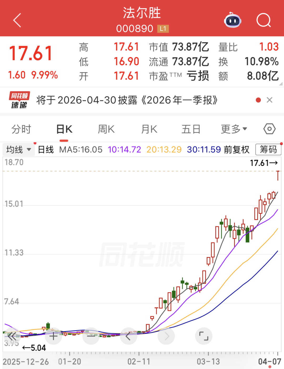 截至上午收盘,法尔胜(000890)股价涨停,最新股价创下历史新高。据证券时报·数据宝统计,截至4月3日收盘,该股年内涨幅排在A股前三位;今日大涨之后,该股今年以来的累计涨幅升至247.34%。