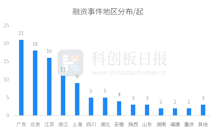 从地区来看,本周广东、北京、江苏、浙江等地公司较受青睐,融资事件数均在10起以上;广东以21起融资活跃度跃居首位。从单个城市看,北京有18家公司获投,位列第一;深圳紧随其后,有16家公司获投。