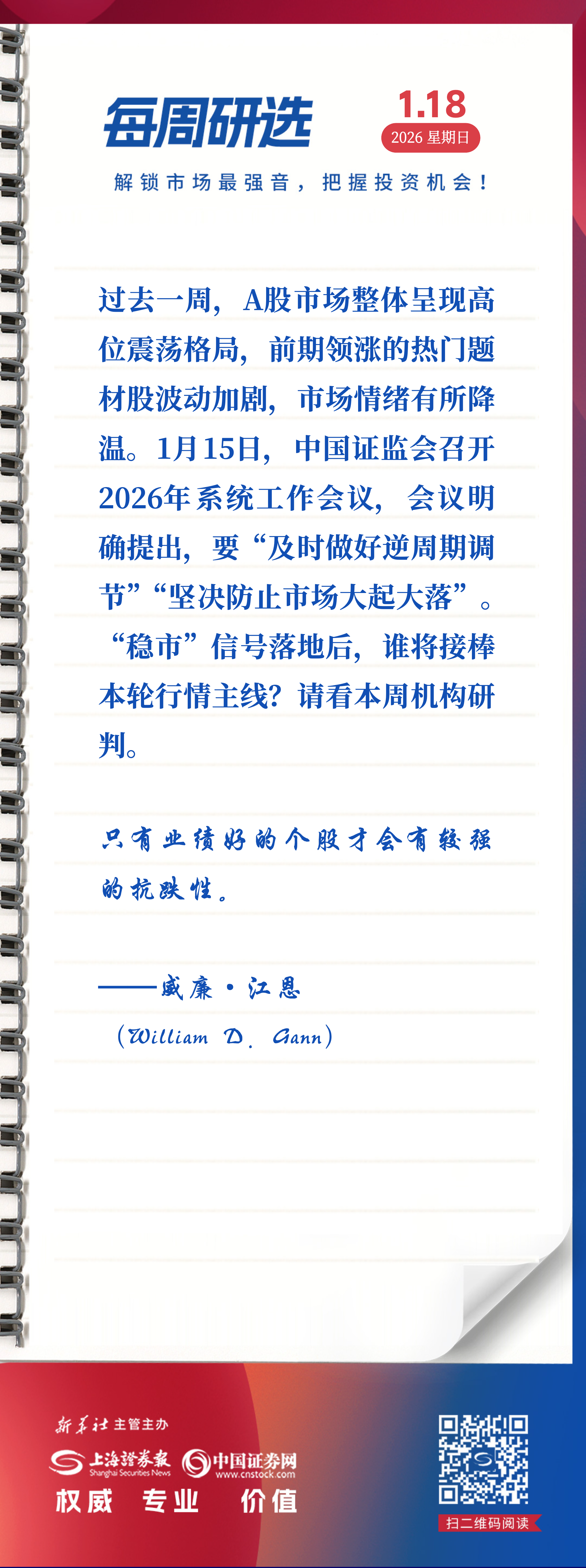 上证报中国证券网讯过去一周,A股市场整体呈现高位震荡格局,前期领涨的热门题材股波动加剧,市场情绪有所降温。1月15日,中国证监会召开2026年系统工作会议,会议明确提出,要“及时做好逆周期调节”“坚决防止市场大起大落”。“稳市”信号落地后,谁将接棒本轮行情主线?请看本周机构研判。