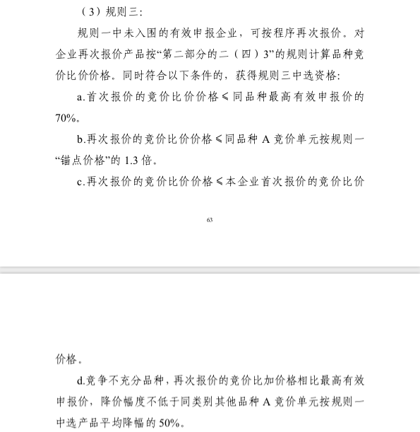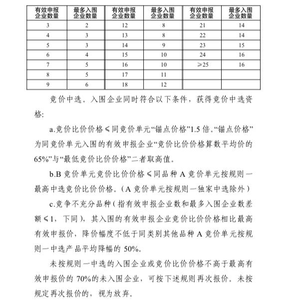 值得一提的是,与之前的征求意见稿相比较,本次正式采购文件出现的一个重要变化就是:锚点价“以同竞价单元入围均价的60%与“同竞价单元最低报价”二者取高值调整为“同一竞价单元入围的企业产品报价的均值的65%与最低产品报价的高值”。