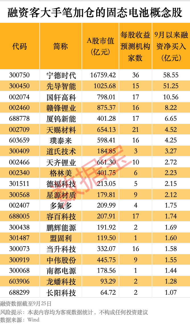 据证券时报·数据宝统计,从资金面上来看,截至9月25日,9月以来融资净买入逾1亿元的固态电池概念股有21只,宁德时代、先导智能、国轩高科、赣锋锂业、厦钨新能等融资净买入额居前。