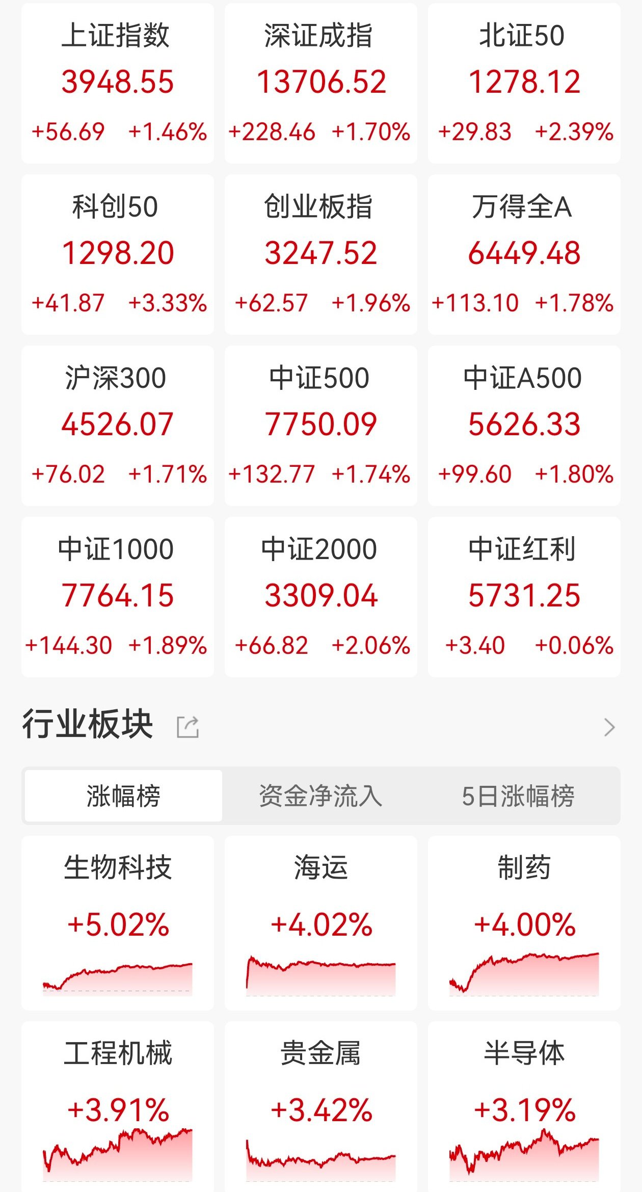 A股收评:三大指数均涨超1.4%,全市场近4500股上涨,创新药、CPO概念走高