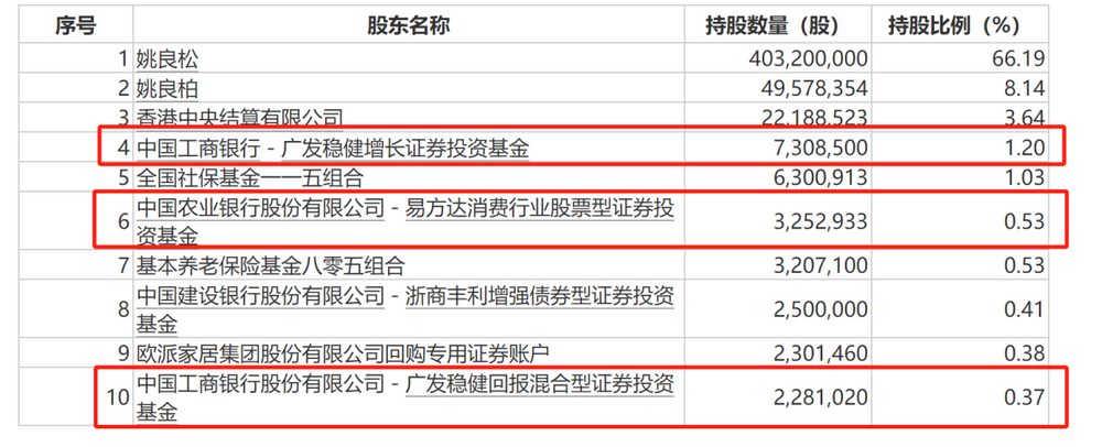 另一个由傅友兴、观富钦、王瑞冬共同管理的广发稳健回报则对该股的持股数保持不变。在今年一季度,该基金对欧派家居的持股数由此前的231.66万股减少至一季度末228.1万股,随后在今年二季度、三季度均未调仓。