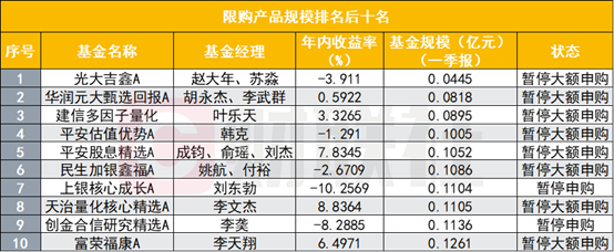 另一方面,就如上述分析所述,“迷你基”限购也可能是规模太小临近清盘,上述市场人士补充,“规模太小濒临清盘的基金,管理人可能也会限购,也是为了保护投资人的利益。”