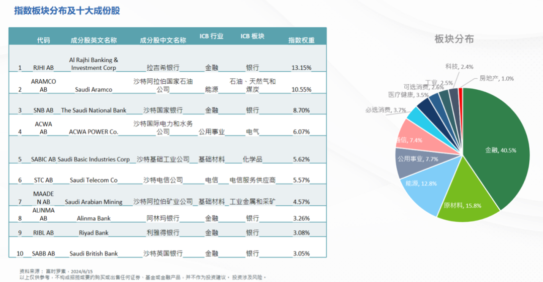 若考虑指数的成份股构成,投资者不难发现其金融占比高达40.5%,其次是原材料15.8%、能源12.8%、公用事业7.7%,科技、房地产占比较低。目前成份股共计60只,每半年调整一次,此前IPO获5倍超额认购的沙特阿美(Saudi Aramco)也是主要成份股之一。
