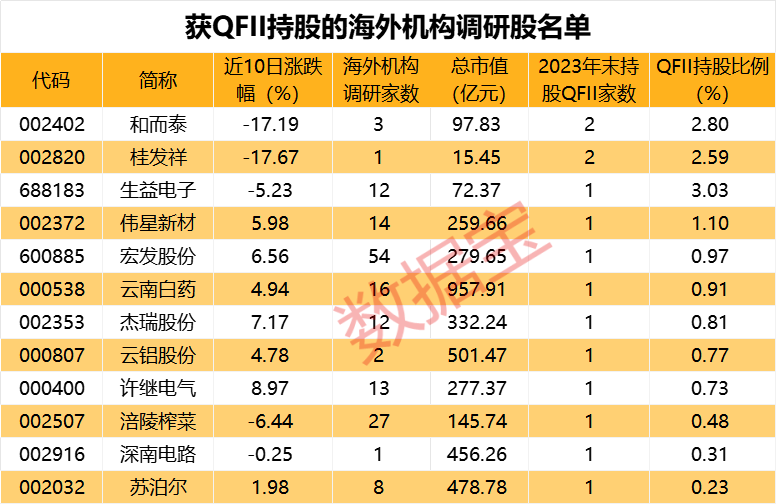 根据年报数据来看,近期获得海外机构调研的个股中,有12股获得QFII机构持仓,其中桂发祥、和而泰2023年末均获得2家QFII机构持仓。以持股比例来看,生益电子的QFII持股比例最大,达3.03%;和而泰、桂发祥、伟星新材的持股比例均超1%。