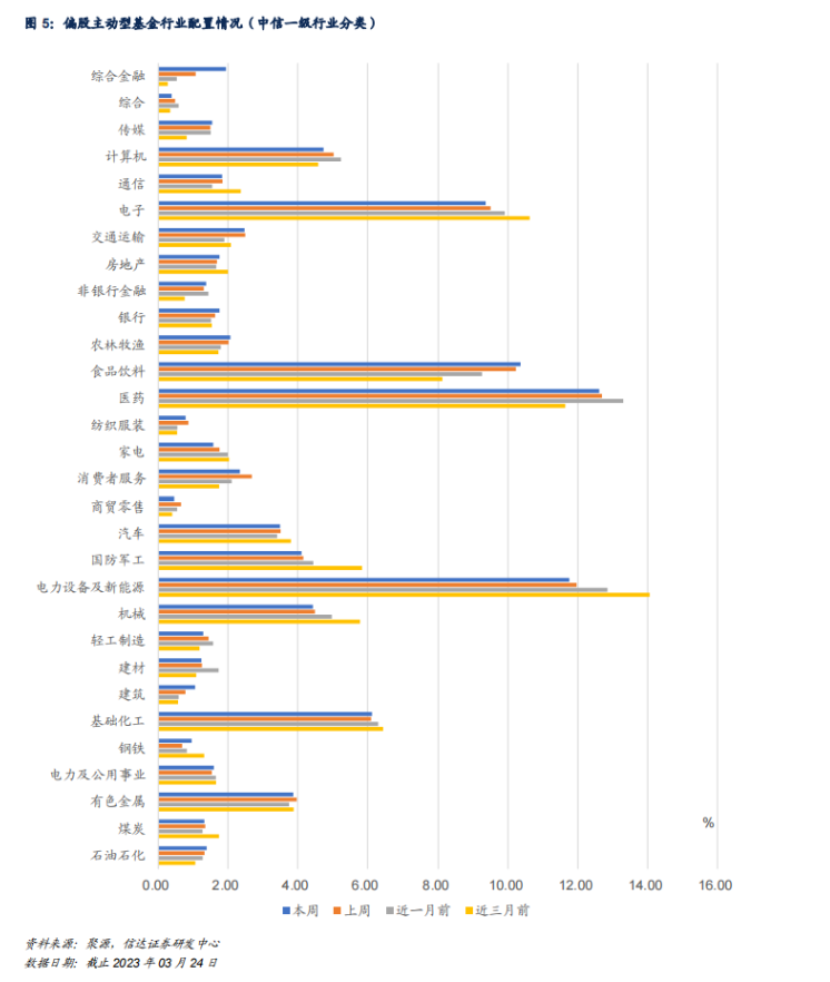 根据信达金工与产品研究团队于3月26日发布的研报显示,近三月,食品饮料、综合金融行业的配置比例持续上调;电力设备及新能源、国防军工、机械、电子行业的配置比例持续下降。其中,食品饮料、综合金融行业的配置比例较三个月前(2022.12.16)分别上升2.245pct、1.664pct;电力设备及新能源、国防军工、机械、电子行业的配置比例较三个月前(2022.12.16)分别下调2.306pct、1.738pct、1.348pct、1.267pct。