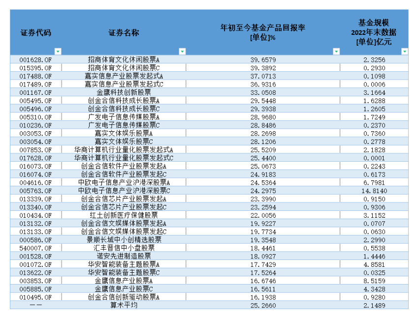以普通股票型基金为例,年初至今回报率排行前30的基金产品(A、C份额分开计算),除中欧电子信息产业沪港深股票规模超10亿元外,其余均为典型的迷你基金。平均规模只有2.15亿元。