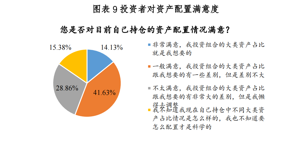 从本质上讲,投资行为决策和资产配置是一体两面,基金选择只是实现资产配置的一种工具。《报告》指出,投资者的配置情况取决于投资者的投资偏好、风险理解等。研究发现有超过50%的用户会考虑通过不同行业进行资产配置,这表明投资者意识到跨行业配置的重要性,希望通过分散投资来降低风险并寻找更多的收益机会。然而仍有25%的受访者尚未养成良好的资产配置习惯。《报告》还显示,目前只有14%的受访者对自己的配置情况表示非常满意,近30%的受访者对自己的配置情况不太满意,认为投资组合的大类资产占比跟想要的有非常大的差别,但懒得去调整。此外还要15%左右的受访者表示,不知道现在自己持仓中不同大类资产占比情况是怎么样的,也不知道要怎么配置才是科学的。