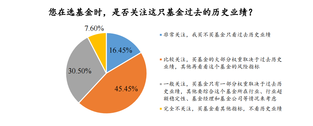 《报告》发现,投资者在选择基金时,历史业绩是一个主要的考虑因素。61%的投资者选择基金产品时,主要关注过去历史业绩这一指标,这其中近2成投资者表示只看历史业绩。为何会这样?《报告》解释到,这是因为历史业绩提供了一个基金管理团队过去的表现和投资策略的参考依据。通过分析基金在过去几年或更长时间内的回报率,投资者可以评估基金的绩效和风险水平,以便做出更明智的投资决策。但还有30.5%的投资者,买基金时只有一部分权重取决于过去历史业绩,其他要综合这个基金所在行业、行业超额稳定性、基金经理和基金公司等情况来考虑。体现出了较周全的综合决策思路。