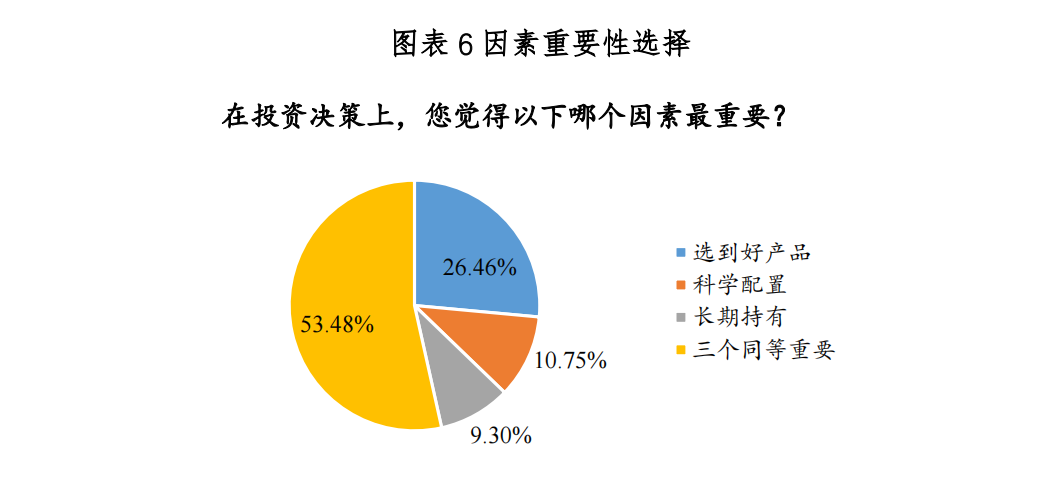 研究结果进一步指出,从样板调研情况来看,在基金投资中,选品、持有时长和配置情况是影响基金的收益体感的关键因素。具体看,超过78%的受访者认为优秀的选品、科学配置、长期持有都是健康的投资行为,有助于提升收益率。在因素的重要性选择方面,53%的投资者认为三类行为同时具备更重要。
