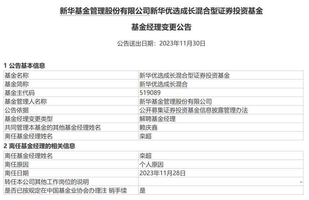 此前的定期报告显示,栾超在今年一季度被升任为新华基金研究部总监。不过,到了今年11月份,他在管的新华鑫益、新华优选成长、新华泛资源优势、新华景气行业等4只产品集中增聘基金经理,截至此次卸任基金经理时,栾超旗下的所有公募产品均为合管产品。