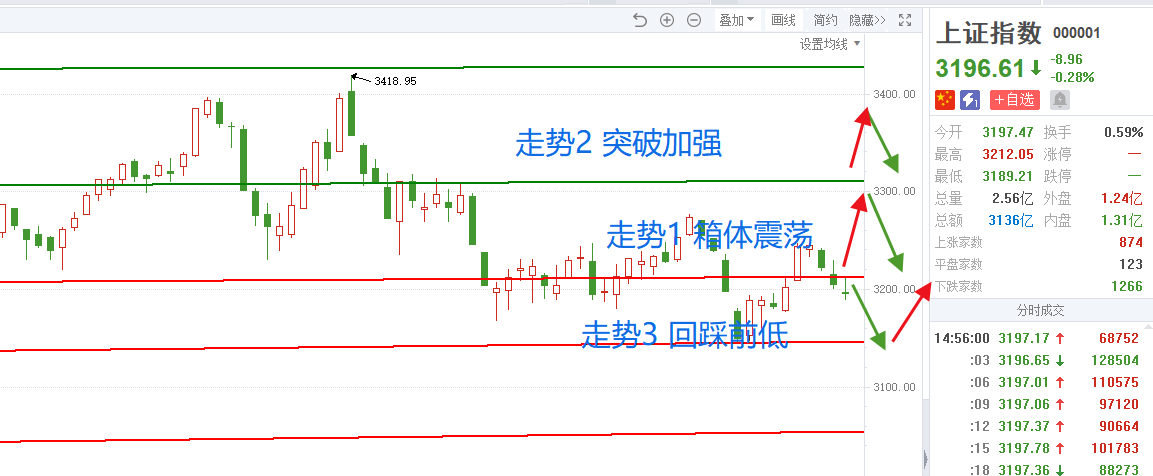 走势1:沪指箱体内震荡,3200-3300点箱体内,也就是维持整个箱体震荡整理的态势。回踩的时候会再次清洗投资者筹码,总体属于波动幅度不大的箱体震荡。