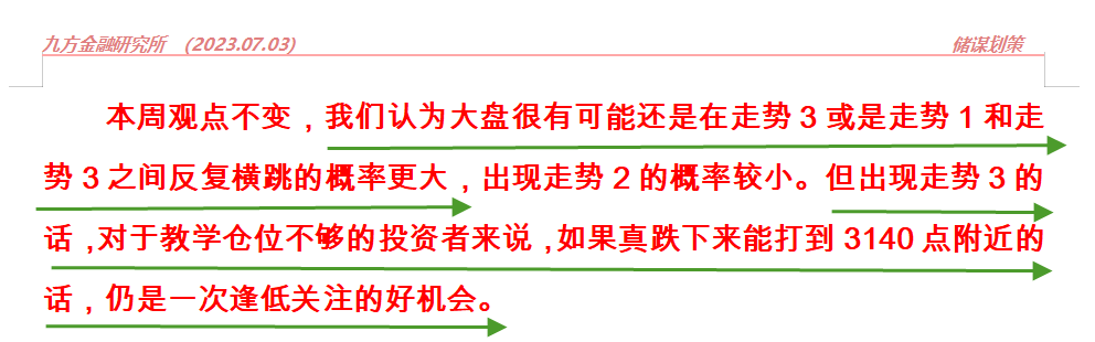 本周观点不变,我们认为大盘很有可能还是在走势3或是走势1和走势3之间反复横跳的概率更大,出现走势2的概率较小。但出现走势3的话,对于教学仓位不够的投资者来说,如果真跌下来能打到3140点附近的话,仍是一次逢低关注的好机会。