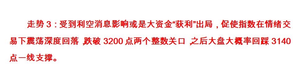走势3:受到利空消息影响或是大资金“获利”出局,促使指数在情绪交易下震荡深度回落,之后大盘大概率回踩3140点一线支撑。