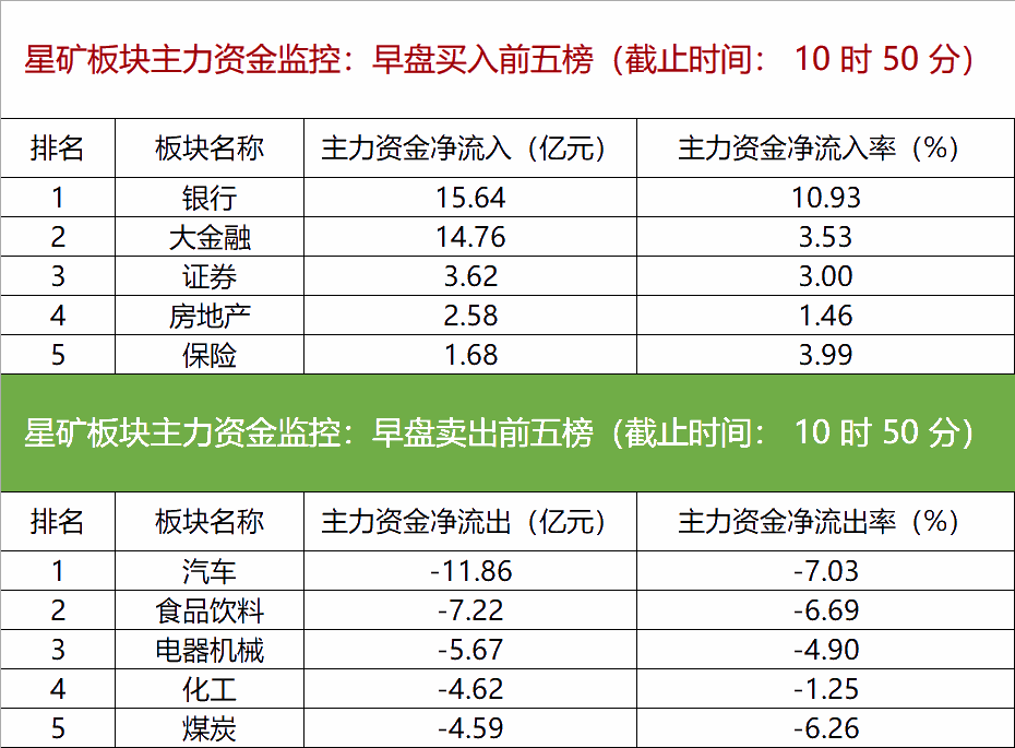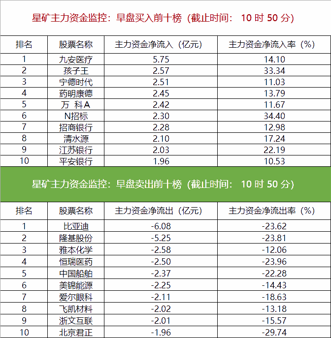 【星矿主力资金监控:早盘买卖前十榜】星矿数据显示,今日早盘主力资金净流入银行、大金融、证券等板块,净流出汽车、食品饮料、电器机械等板块,其中净卖出汽车板块超11亿元。个股方面,九安医疗涨停,主力资金净买入5.75亿元,孩子王、宁德时代、药明康德获主力资金净流入居前;比亚迪遭净卖出超6亿元,隆基股份、雅本化学、恒瑞医药等主力资金净流出额居前。