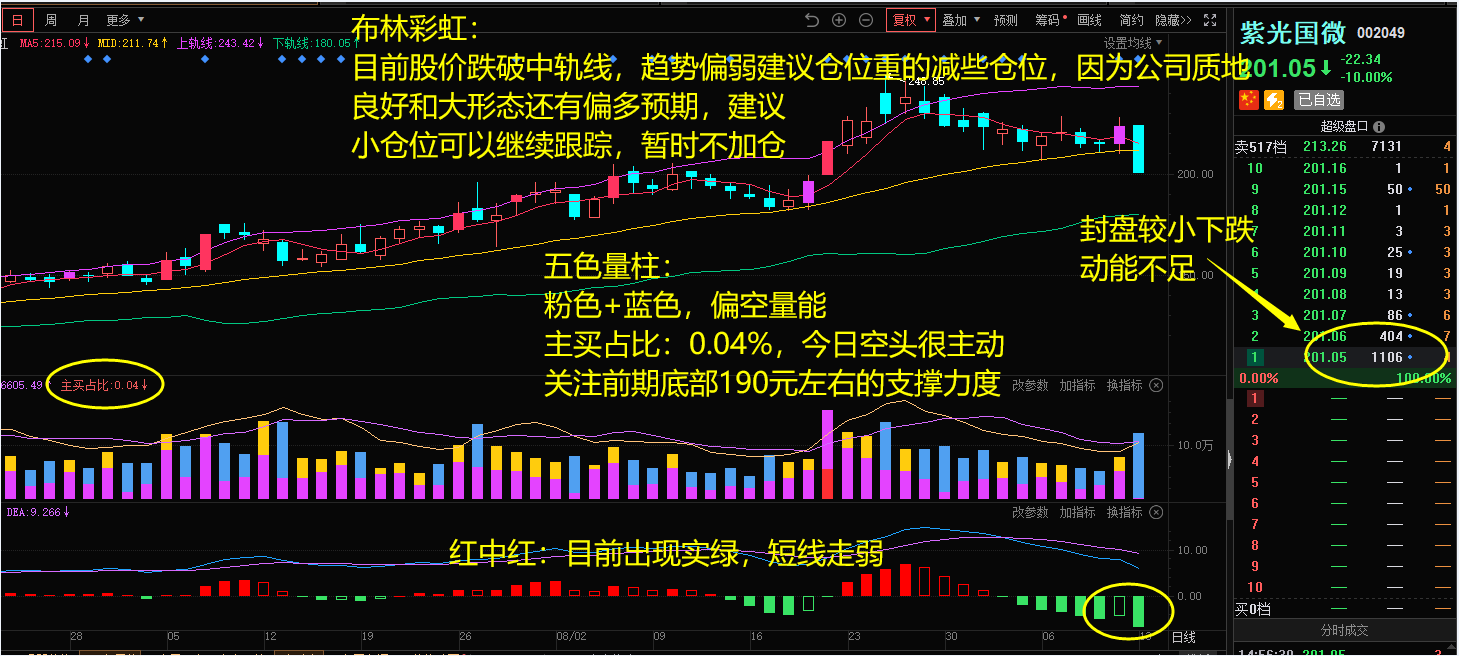 短线该股跌幅较大,明日预期惯性下冲,前期低点185元上方支撑相当强劲,多头不用多虑,下方下跌空间不大。还有筹码的投资者可以根据我给的支撑区域结合我们投研工具里的《做T降成本系列》结合布林彩虹下轨线短期支撑,上轨线短期压力,学以致用!