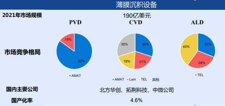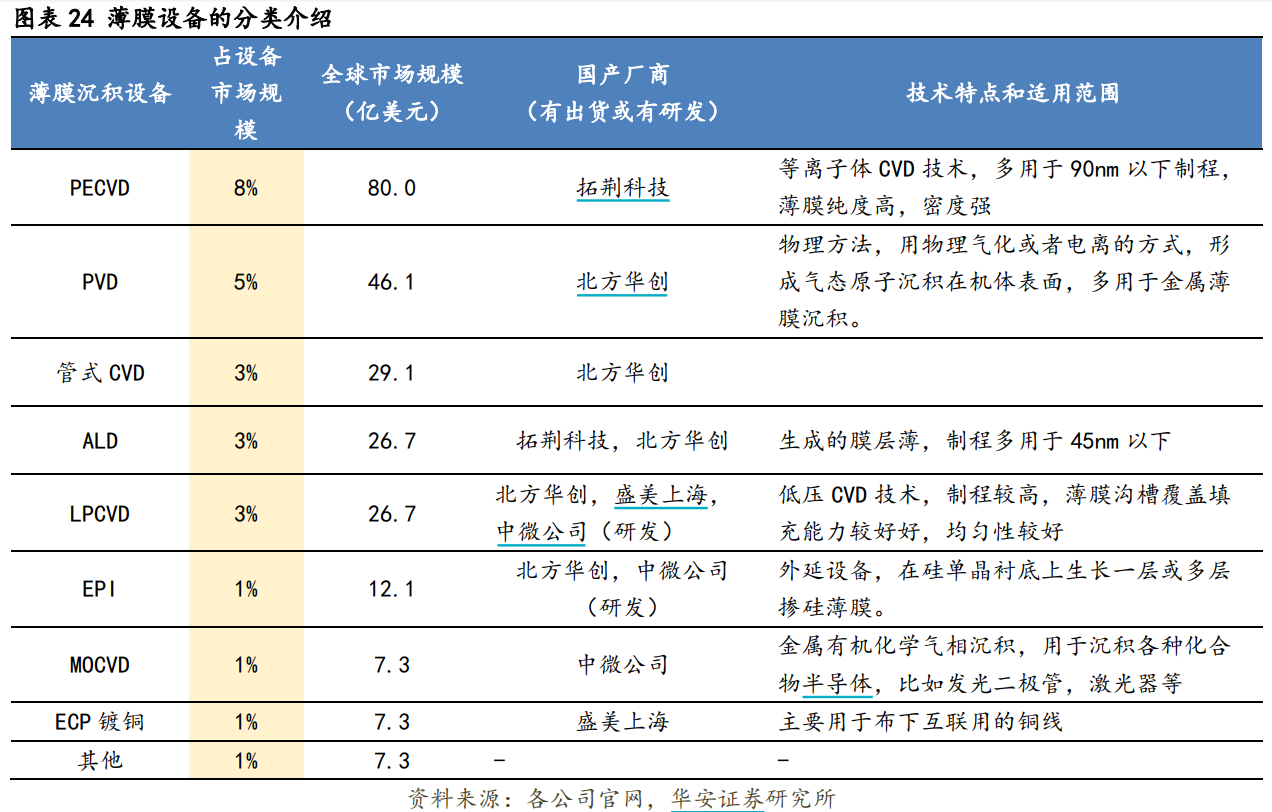 薄膜沉积设备大致可以分为CVD化学气相沉积设备,PVD物理气相沉积设备和外延设备三大类。CVD占据了接近一半的市场份额。