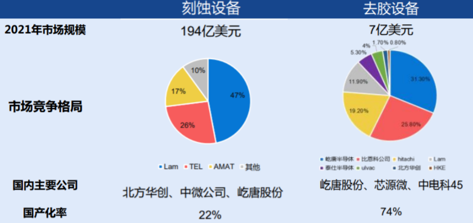 国产厂商在刻蚀设备领域较早的实现了突破。现阶段,刻蚀设备的整体国产化率达到了20%,下游晶圆厂仍有持续替代的意愿和空间,预计刻蚀设备的终局国产化率可以达到70%以上,目前国产替代正在向高深宽比刻蚀,大马士革工艺等先进制程适用的刻蚀工艺突破。国产刻蚀设备的工艺水平正在向28nm以下,14nm,7nm,5nm的方向发展。