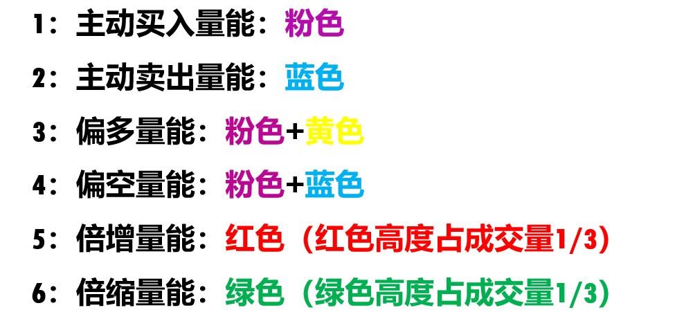 有少部分朋友,对《五色量柱》不同颜色组合的含义,还不清楚。大家可以把下面这个图保存一下,对着个股日K五色量柱指标,学以致用。