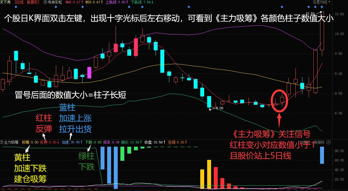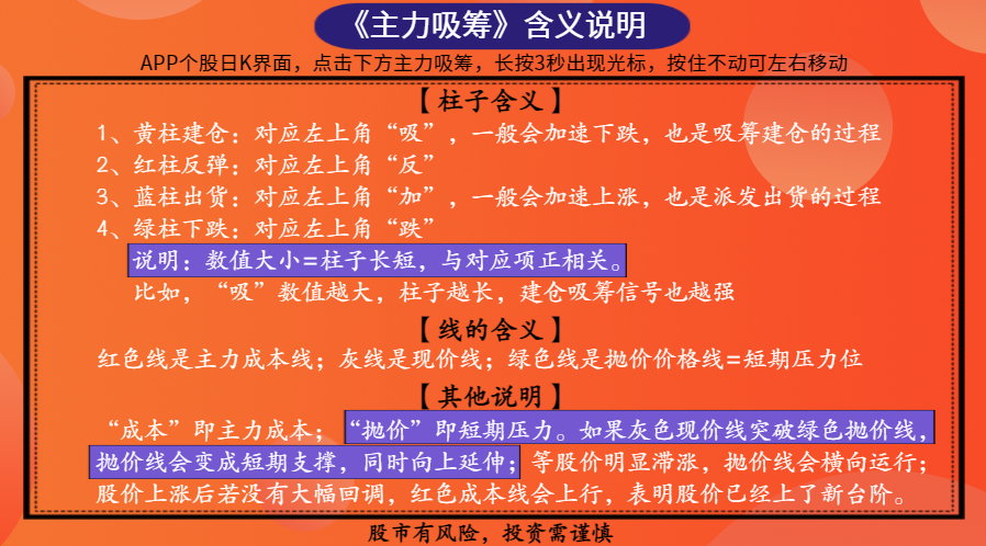 PC个股日K界面,双击鼠标,移动至橘黄色(加速下跌),左上角的“吸”会显示数值,对应的是柱子长短。柱子的长短代表吸筹的情绪高低,柱子越长,说明吸筹的欲望越强。一般来说,阶段底部,股价越低,柱子越长。