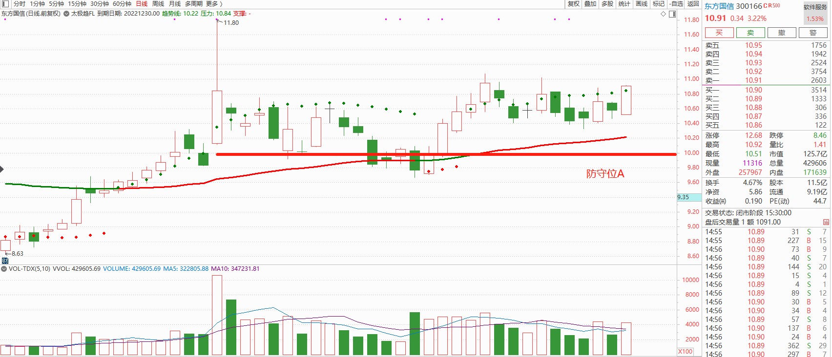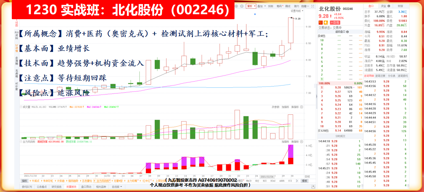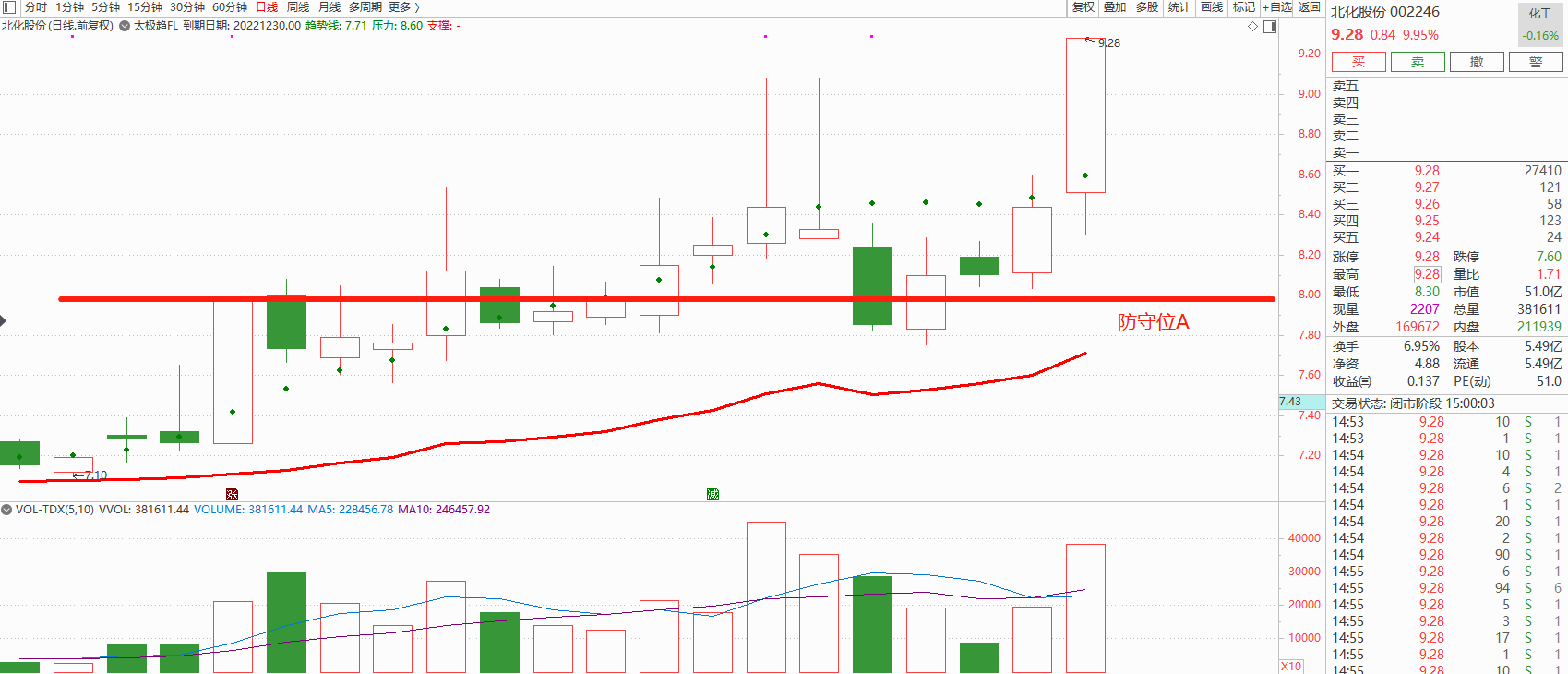 北化股份,从题材热点来看,属于医药奥密克戎方向,近期欧美疫情较为严重,公司属于检测试剂上游核心材料,同时叠加军工属性,近期趋势线右侧阶段,趋势线附近小幅企稳之后放量涨停突破前期高点,尾盘封单不是特别大,这里耐心等待后期回踩波动上轨支撑位上方再次夯实之后,或许是一个不错的低吸机会,防守位设置前低盘整平台低点A附近,保持耐心显得比较重要。