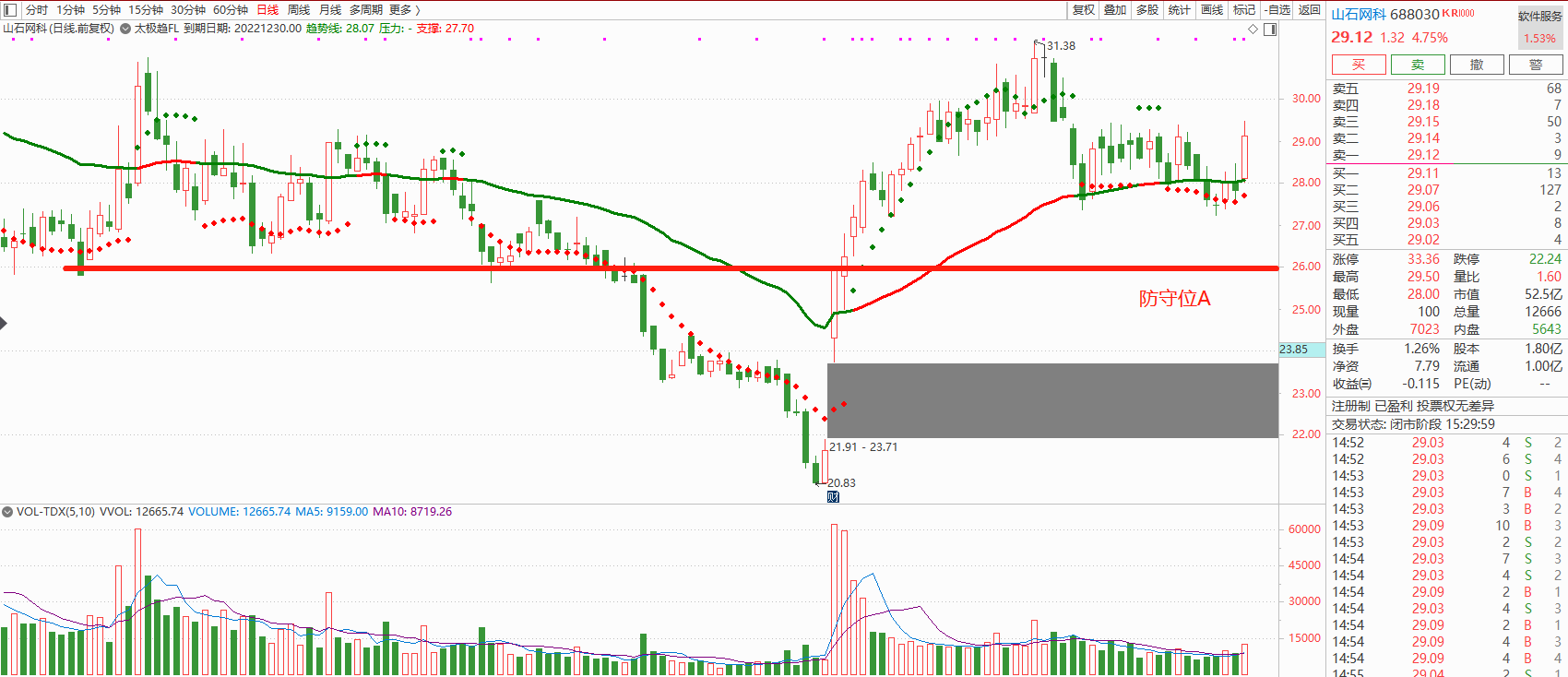 山石网科,从题材热点来看,属于网络安全方向核心小盘个股,而且年报披露季,业绩存在超预期的机会,日线级别级别趋势线上方红色阶段,回踩日线级别趋势线附近企稳,若能补量突破前期高点,上行空间有望进一步打开,防守位设置下方关键支撑位A附近,失守则控制风险。