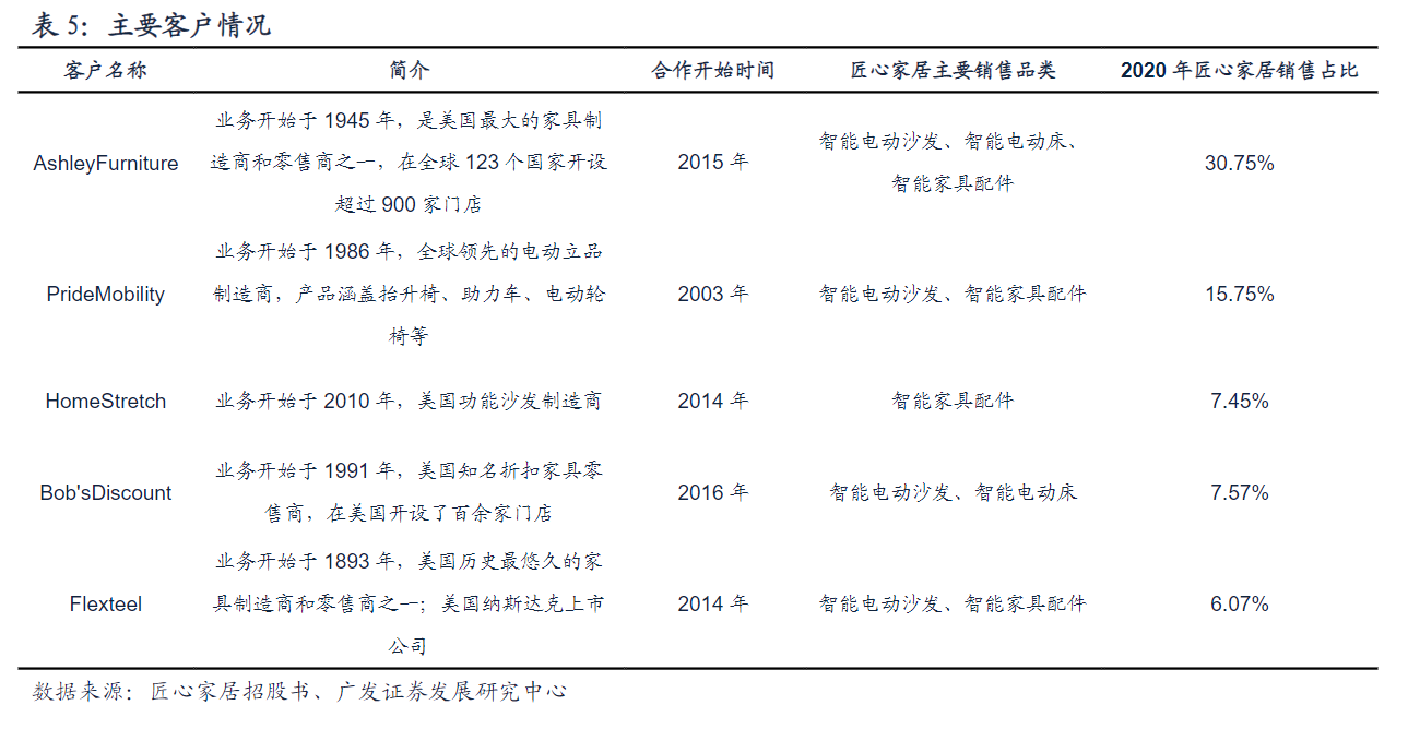 公司覆盖知名家居品牌,客户集中度高,智能电动沙发、智能电动床等产品在全球行业范围内具有优良的口碑,与多家国际知名品牌建立了合作关系,与客户关系稳定,未出现核心客户流失情况,2020年公司前五大客户占比达67.6%,2021年前五大客户占比为64.22%。