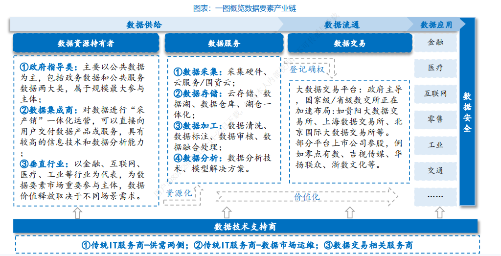 综上,数字经济已成为我国经济发展的重要驱动力,数据要素重要性逐步提升。随着数据要素相关方面的顶层政策体系形成,数据要素产业正进入加速发展期,从原始数据到数据要素价值释放的整个产业链有望腾飞。梳理国内相关上市公司,主要参考如下~