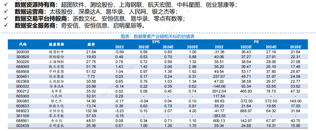市场规模方面,2021年我国数据要素市场规模达到815亿元,预计“十四五”期间CAGR将超过25%,数据采集、数据服务和生态保障存在较大的成长空间。掘金数据要素产业链,数据资源持有商随着企业数据资产入表政策落地以及AI大模型发展,未来内生价值与外在需求有望显著提升。数据运营商的“国资云”厂商有望与国资委共建共营,在提供技术支持的同时享受数据资产托管运营红利。另外,数据交易平台、数据安全服务商随着数据要素交易进入2.0时代也有望充分受益。