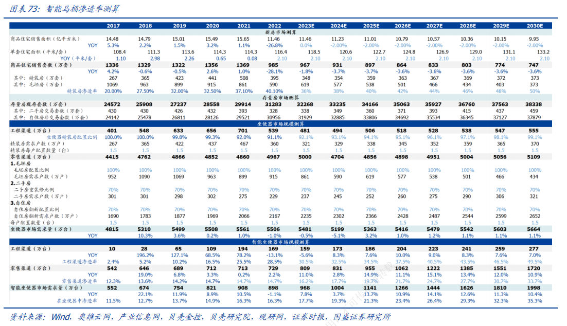 机构预计2022年我国住宅坐便器市场需求约为5500万台,其中智能坐便器需求量渗透率约为16.3%,到2030年智能坐便器渗透率将达到约35%,智能坐便器市场需求量达1998万台,2022-2030年CAGR为10.5%。