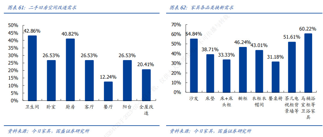 需求端,根据《智能马桶行业发展白皮书》,43%消费者购买智能马桶的原因为重装/新购房屋,21%来自于对智能马桶认识加深。根据住建部数据,目前我国大约有17万个老旧小区,覆盖约0.4亿个家庭。在各地政府全面推进城镇老旧小区改造工作下,有望持续为智能马桶市场贡献增量。据今日家具,42.9%的二手房业主具有卫生间改造需求,马桶、浴室柜等卫浴家具换新需求最为强烈,60.2%的消费者将智能马桶视为改造翻新后必换品类。