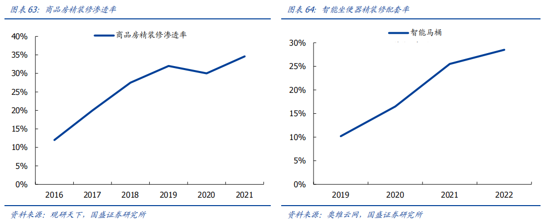 商品房精装修方面,根据奥维云网数据,2022年我国智能坐便器配套数量为41.61万套,精装修配套率由2019-2022年由10.2%增长至28.5%。卫浴空间智能化、舒适化大势所趋,叠加价格下行配套成本降低,智能马桶未来有望成为精装修标配产品。