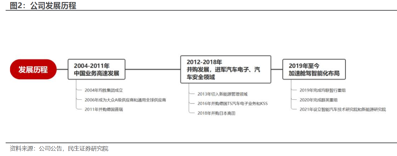 公司是国内顶级汽车零部件供应商,致力于智能驾驶系统、汽车安全系统、新能源汽车动力管理系统以及高端汽车功能件总成等的研发与制造,依靠并购迅速成为国内一线零部件企业,公司收入规模位列国内零部件行业第二,是国内当之无愧的汽车电子与汽车安全龙头企业。