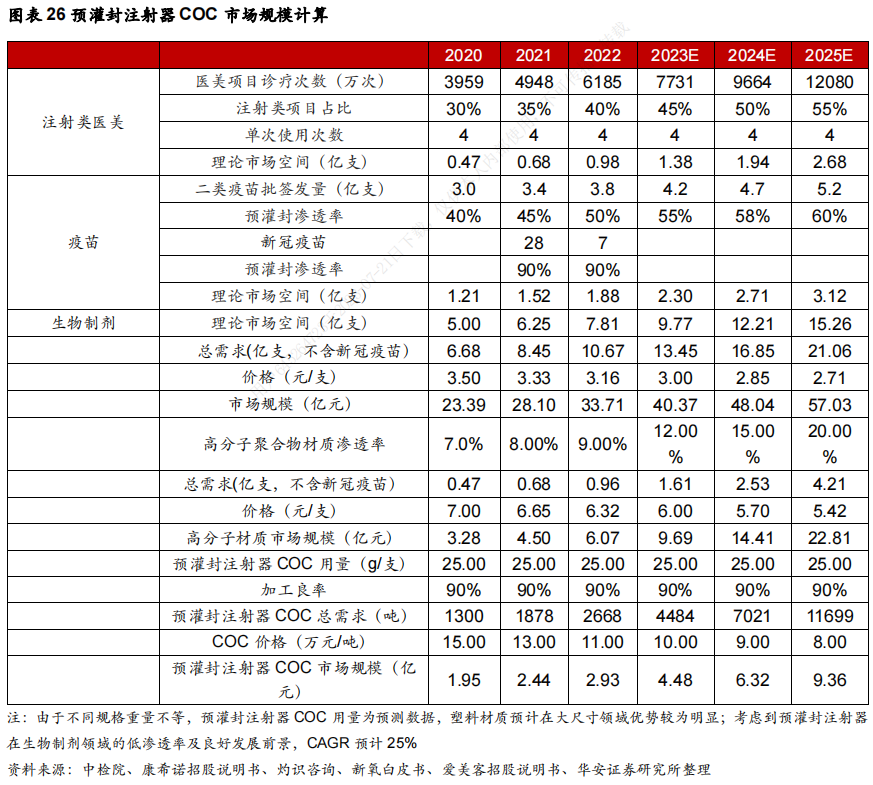 医药包材领域来看,从2022年起,COC相关材料申请登记的品种显著增加,且应用领域和种类明显拓展,行业发展正在加速。其中,预灌封注射器是增速最快的细分类别。对于价值高昂、敏感类的生物制剂及低温条件下的mRNA疫苗而言,预灌封注射器药物使用率较高。由于COC有更好的药物稳定性、高度的生物相容性,COC塑料管替代玻管正好应用于此。数据预测显示,到2025年COC相关材料在预灌封注射器需求将达到1.2万吨,对应市场规模9.36亿元。