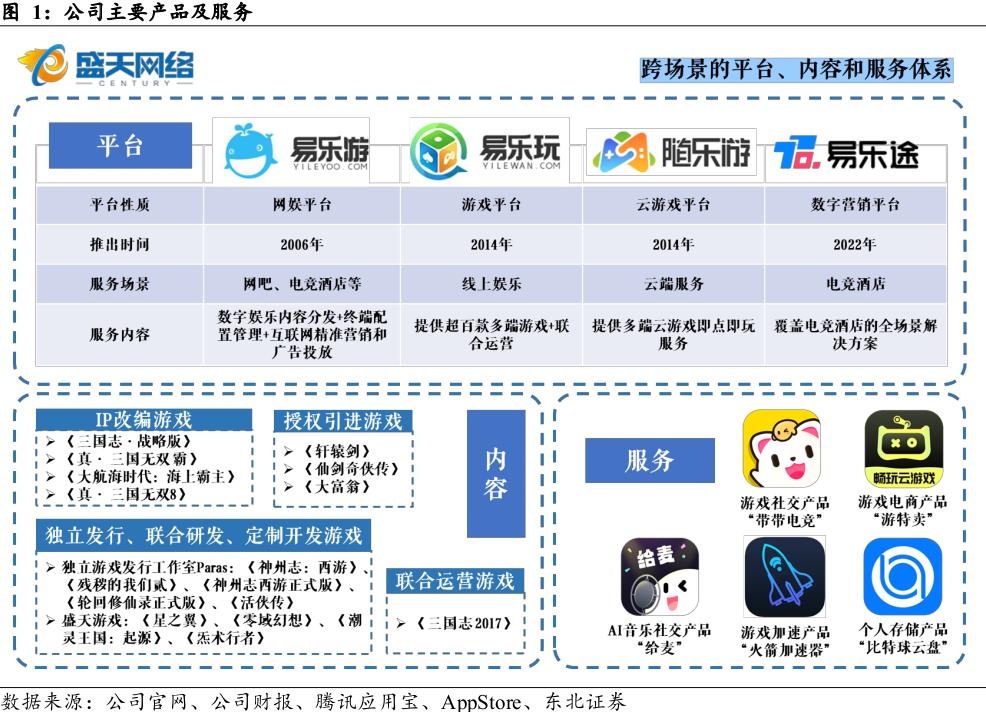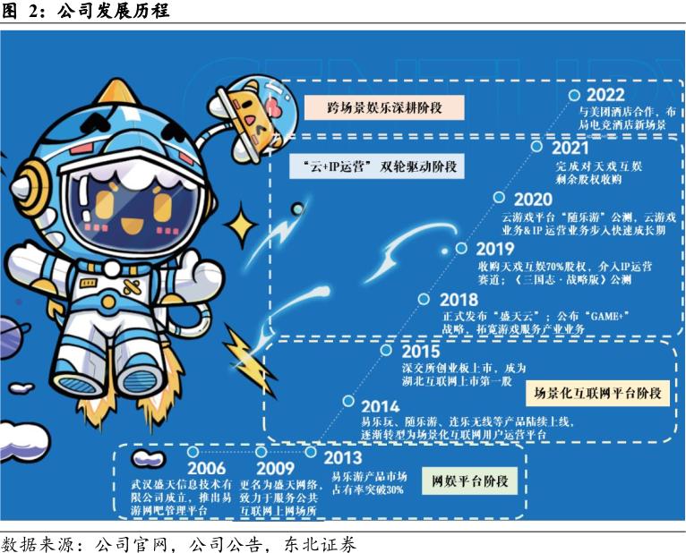 公司是网吧起家完成原始积累,顺势转型进军云游戏,盛天网络以易游网吧管理平台起家,2014年以前“易乐游”奠定网吧业务基础。2018年起,Game+业务矩阵效应初显,整合旗下游戏、电竞、社交等服务和内容,强化体系内板块运营及产业上下游的联动共赢。2019-2021年公司收购天戏互娱为全资子公司,进一步拓展游戏IP运营业务,通过提供IP引进和授权、IP游戏监修等服务,以服务费或分成形式获得服务报酬,云游戏列入公司发展规划,2021年“随乐游”云游戏平台上线,目前处于市场培育阶段。