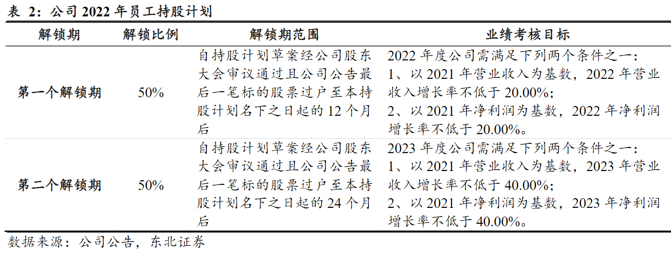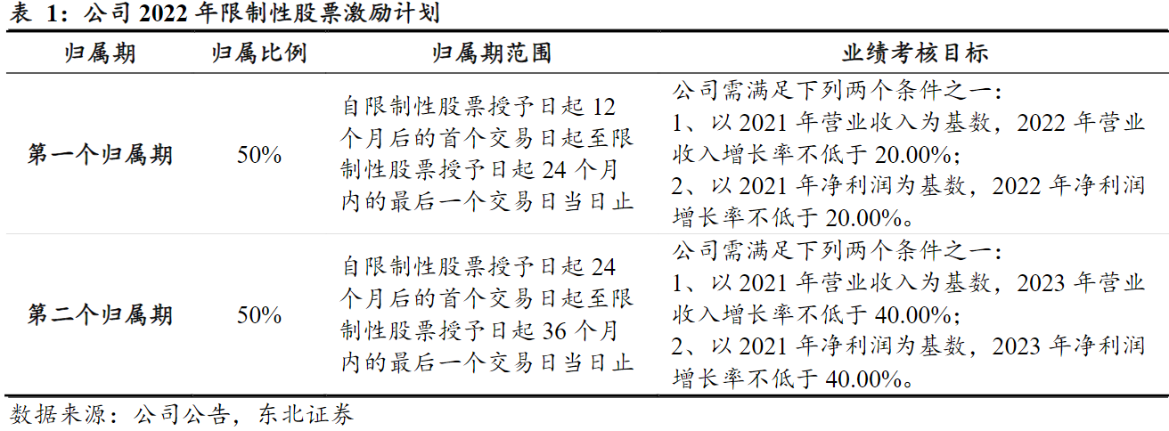 公司于2022年7月发布股权激励计划,激励对象共105人,拟授予第二类限制性股票数量为87.5万股,授予价格为7.04元/股,在授予日起满12个月后分两期归属,归属的比例分别为50%、50%,第一个归属期的条件为营收或归母净利润同比增长20%;第二个归属期的条件为2023营收或归母净利润增长40%。