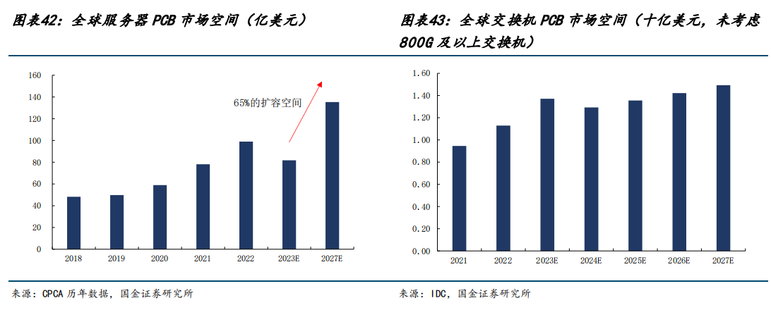具体而言,PCB板子的数量相比以前将大幅增加,AI服务器架构上多出的GPU层,会使得单机PCB板的数量首先得到增加。另外,除了板子数量增加之外,PCB板性能也会提升。在这样的驱使下,AI服务器的增长将显著带动PCB价值量提升。根据CPCA引用数据,预计2027年服务器PCB市场空间将达到135亿美元,相对2023年82亿美元市场规模仍有65%的扩容空间。