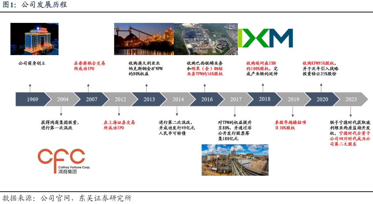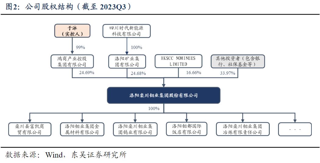 公司2014年进行混改,实现“国资参股,民资控股”,实现国际化跨越式发展,控股股东为鸿商产业控股集团有限公司,持股比例为24.7%,实际控制人为于泳先生,鸿商产业集团投资覆盖矿产资源、航空运输、环保节能等多个领域,2023年3月宁德时代全资子公司四川时代新能源成为公司第二大股东,持股比例为24.7%,股权结构清晰。