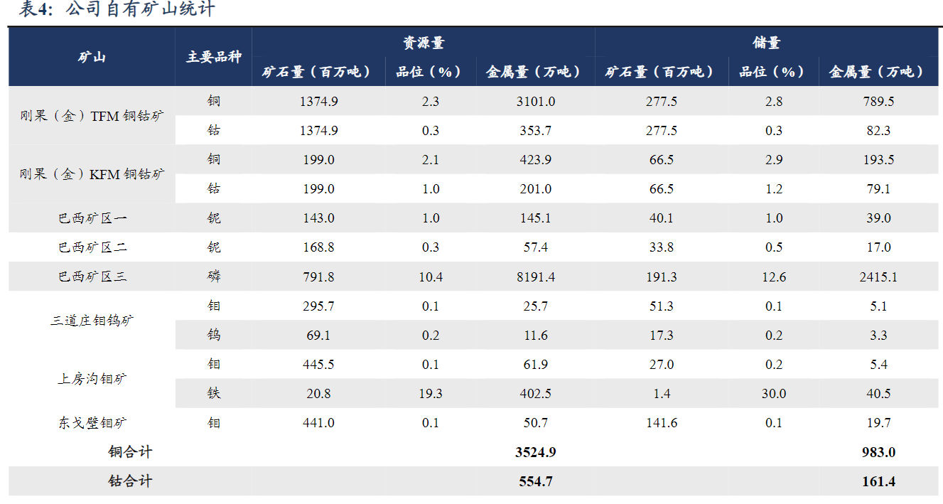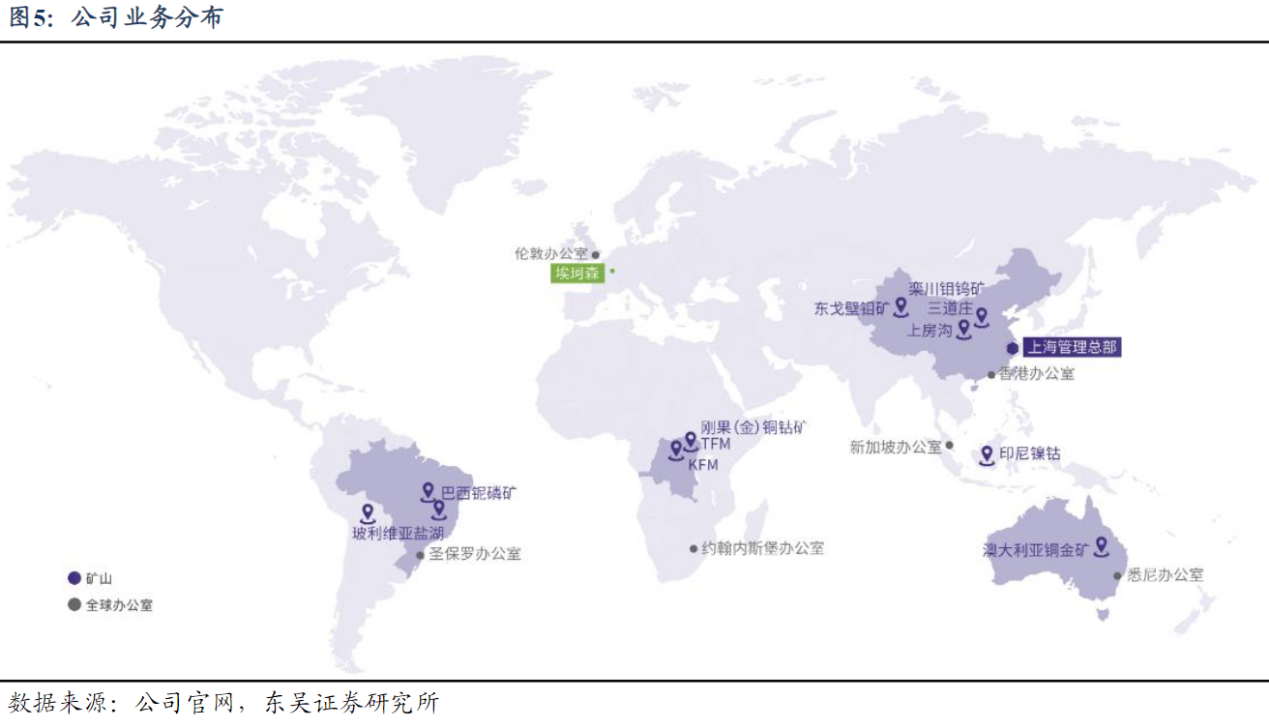 公司全球布局,颇具资源禀赋,目前已经形成中国-钼钨、刚果(金)-铜钴、巴西-铌磷、澳洲-铜金和埃珂森贸易公司五大业务板块,此外与宁德时代合作共同开发玻利维亚境内两座巨型盐湖,并建设锂提取工厂;参股华越镍钴项目30%股权。