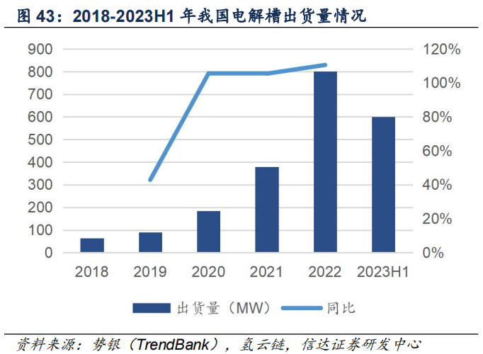 而在碱性电解水制氢系统中,电解槽是重要构成部分。氢气产量和需求量的快速增长也为电解槽的需求带来了可观的市场空间。2022年我国氢气产量4004万吨,同比增长21%,2022年全国电解槽出货量近800MW,较2021年实现翻倍增长。2023年来看,上半年电解设备共计招标已超600MW,预计2023年电解槽全年需求量有望持续实现翻倍。
