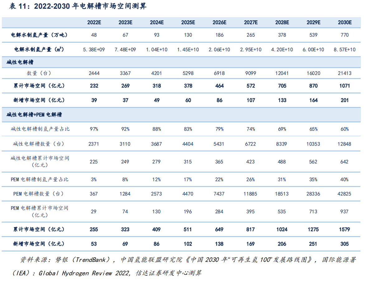 市场空间分析来看,若考虑市场中仅有碱性电解槽的情况,机构预计到2025年碱性电解槽需求量约为5298台,碱性电解槽新增市场空间约60亿元,累计市场空间约378亿元;到2030年碱性电解槽需求量约为21413台,碱性电解槽新增市场空间约201亿元,累计市场空间约1071亿元。若再加上PEM电解槽,则2025年、2030年电解槽市场空间有望分别达到511亿元、1579亿元。
