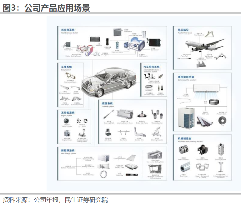 公司产品主要应用于汽车领域,在传统燃油车和新能源汽车上均有较多应用,终端应用领域主要是汽车行业,并已逐步覆盖航空航天、轨道交通、白色家电、海洋工程等其他工业领域。产品种类丰富,规格型号众多,包括热管理系统铝材、底盘安全系统铝材、三电车身系统铝材等,具有“多品种、多牌号、多规格”的特点,可以满足不同行业客户的多样化需求。