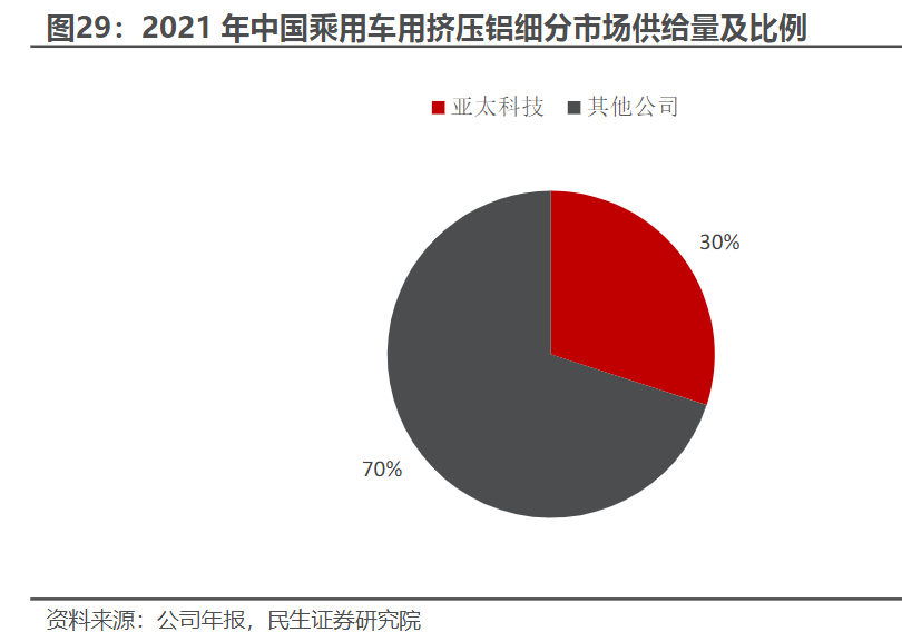 新能源汽车型材已是工业铝型材应用增长最快的细分领域,挤压相对铸造的格局更清晰,公司是稀缺标的,在该细分市场份额超30%,先发优势明显,格局更优。从应用分布上看,受益于新能源汽车行业的快速发展,2021年和2022年我国新能源汽车铝型材产量分别为33万吨和75万吨,呈快速增长态势,2022年增速高达127.3%。亚太科技属于工业铝型材生产厂商,自成立来便专注乘用车细分市场铝挤压材,2021年市占率约30%,在乘用车市场具备龙头地位,先发优势明显,所处赛道增长潜力巨大,竞争优势显著。